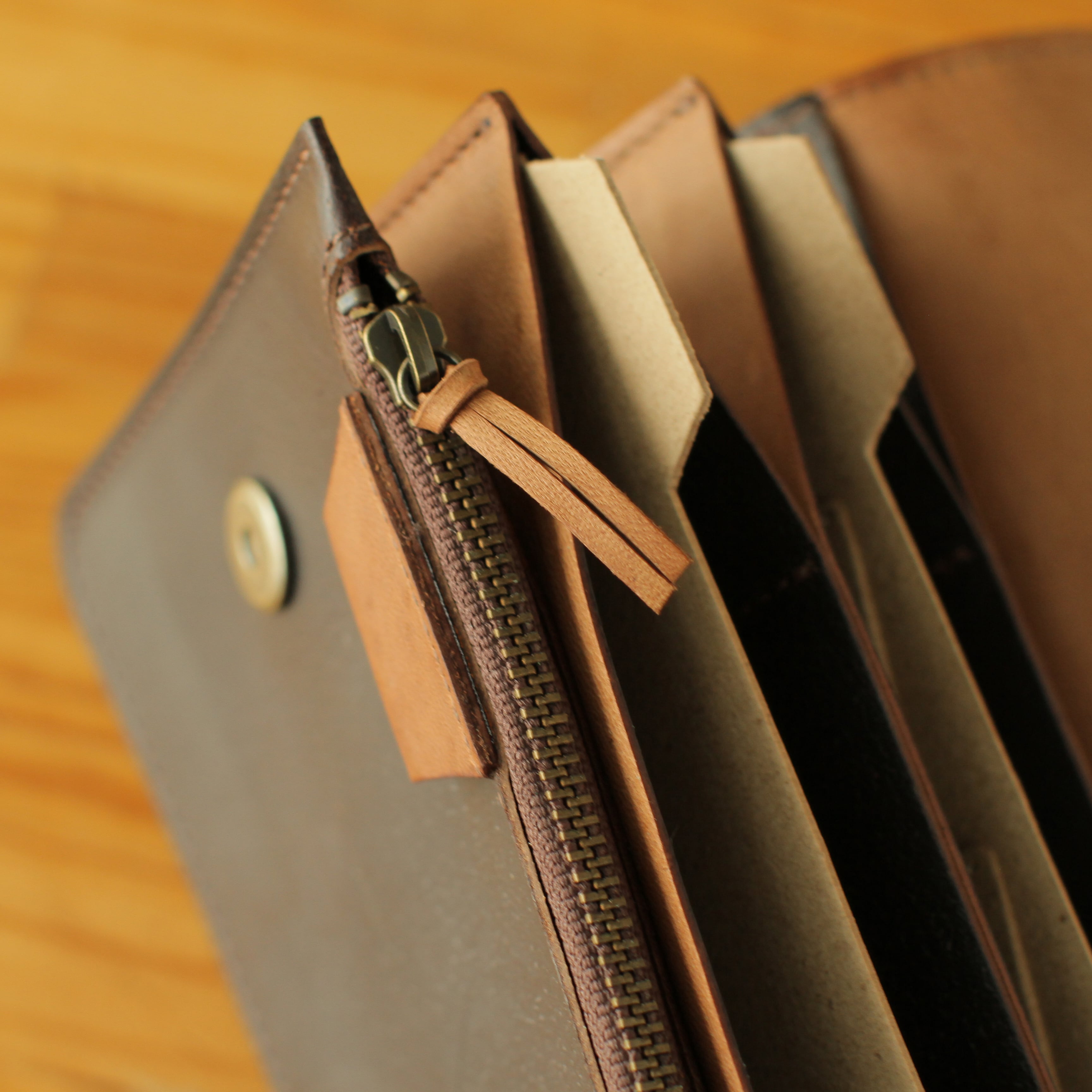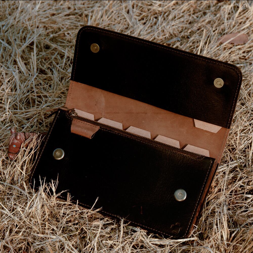 たっぷり入る大きなポケットと、仕切りに便利なインデックス。領収書と仮払金を、作品ごとに分けながらも、ひとつのサイフで管理。